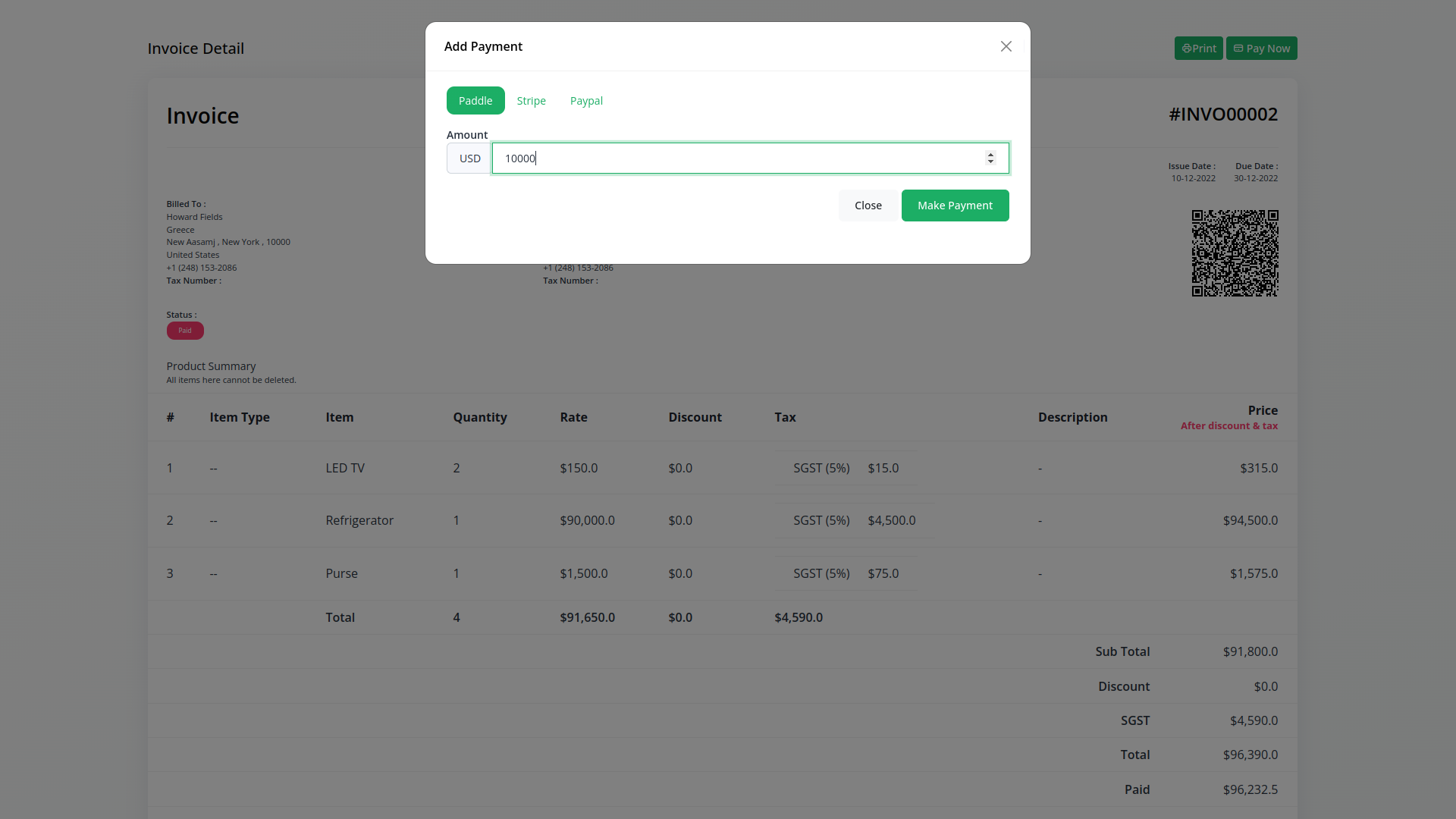 Using paddle payment gateway you can easily pay money in invoice module ,sales invoice module ,Retainer module and Plan purchase. Also we provide order summary after payment that`s why you can easily see your payment transaction any time.